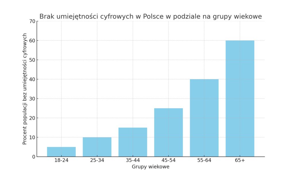 Oto wykres przedstawiający brak umiejętności cyfrowych w Polsce w podziale na grupy wiekowe. Wykres pokazuje, że wykluczenie cyfrowe jest najbardziej widoczne w starszych grupach wiekowych, gdzie nawet do 60% osób w wieku 65+ może nie posiadać podstawowych umiejętności cyfrowych. Naszym celem i podstawowym założeniem jest zmniejszenie tej bariery w każdej grupie wiekowej do najniższego możliwego poziomu.